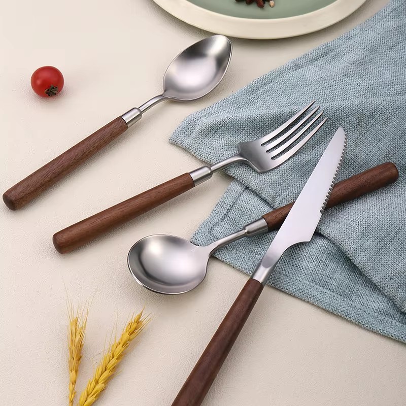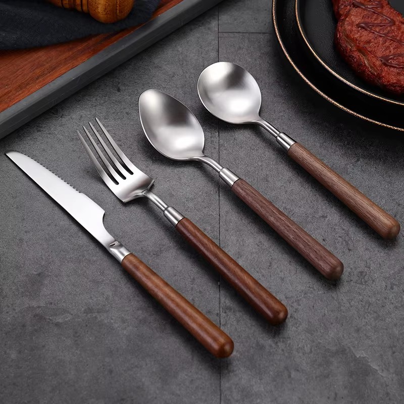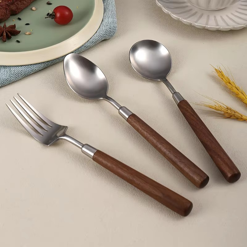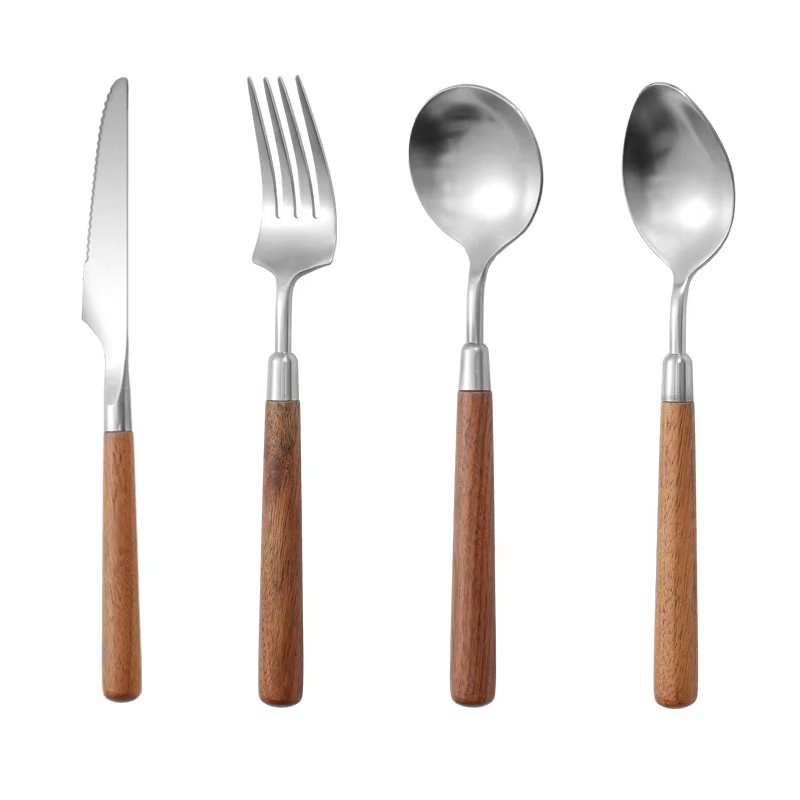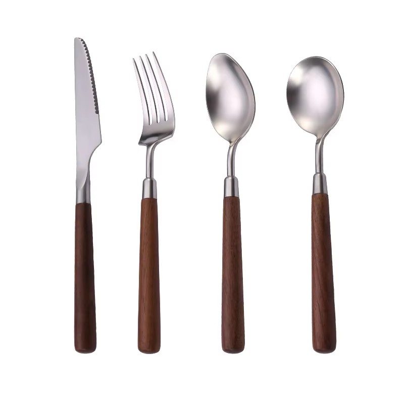 DINUO wooden handle metal high-quality matte western tableware knife, fork, spoon silver JYDN-L-031