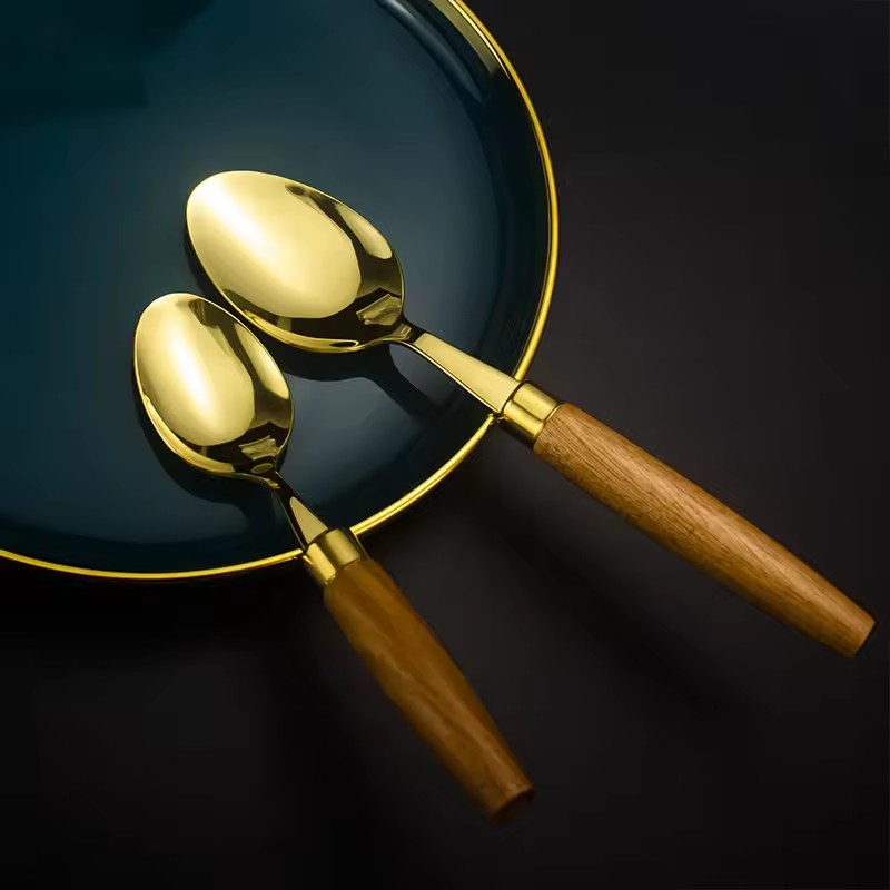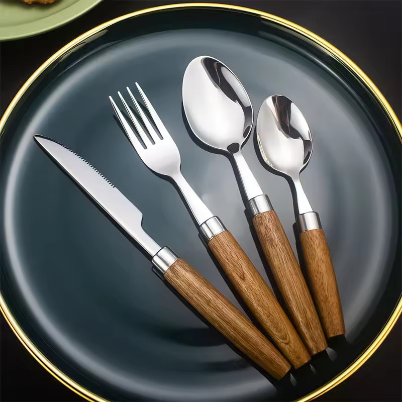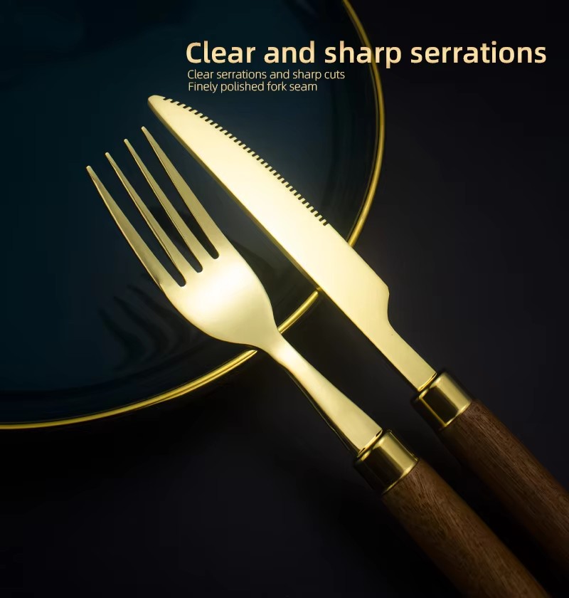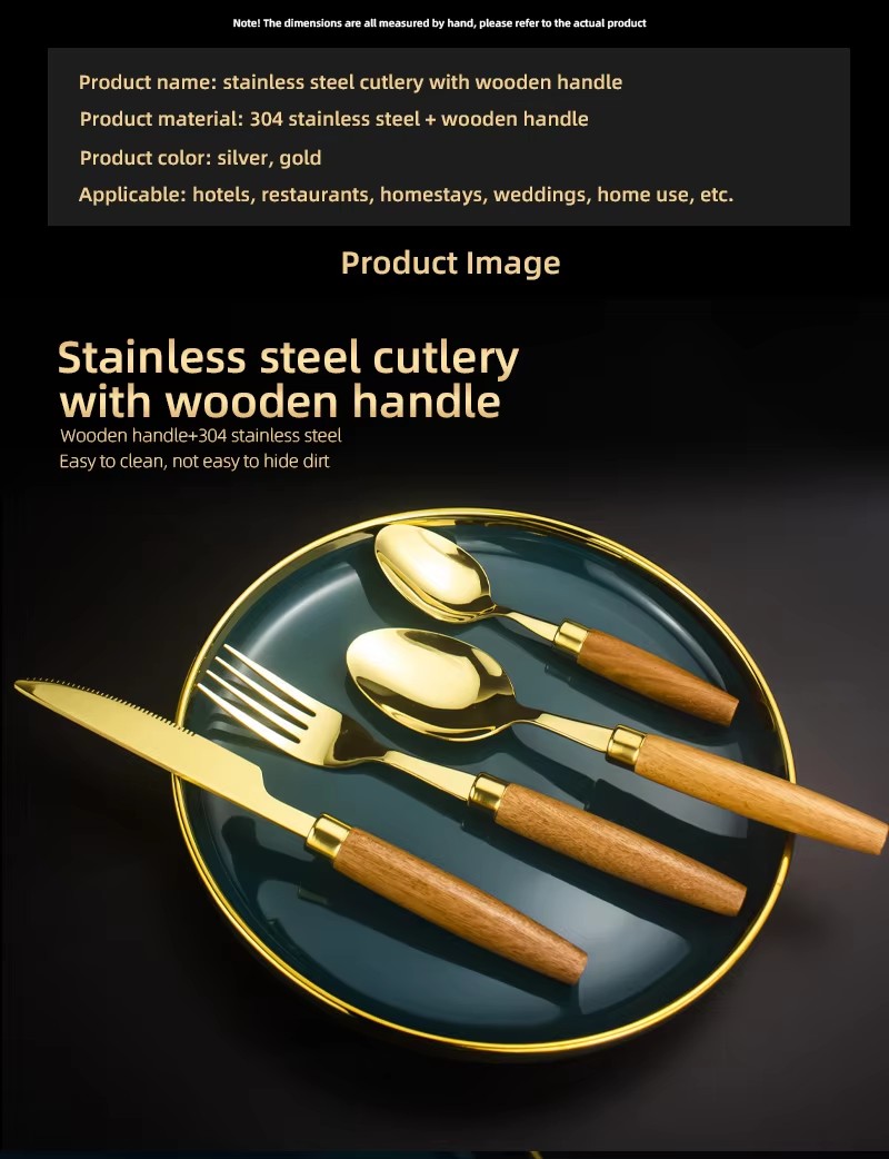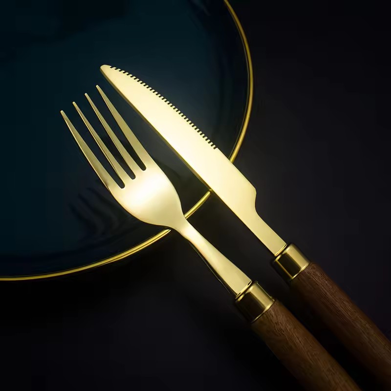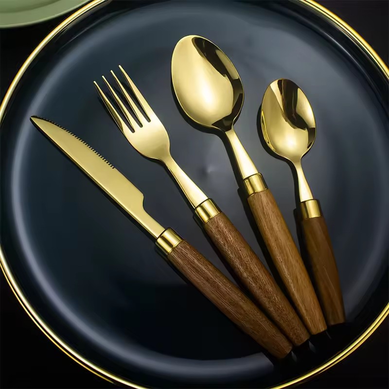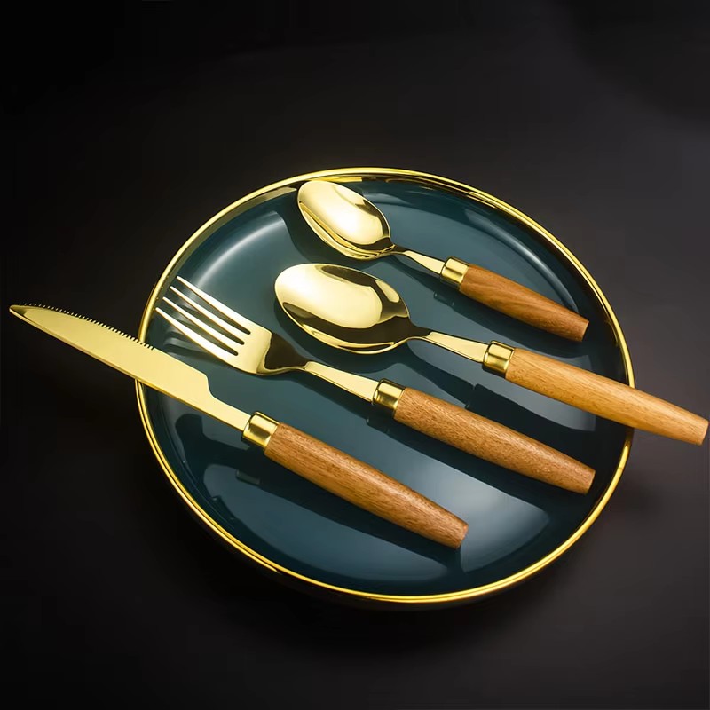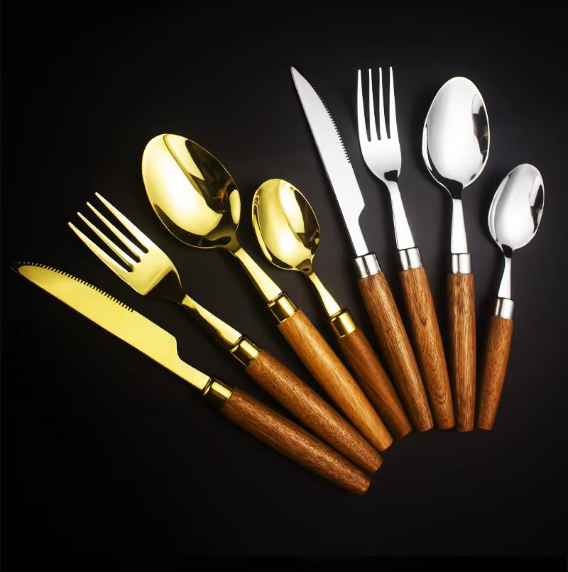 DINUOEco-friendly Wooden Handle Stainless Steel Cutlery Silver Gold Flatware SetJYDN-L-033